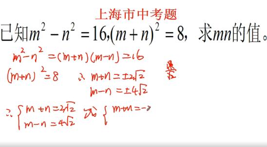 上海中考数学题,解方程m2-n2=16,(m+n)2=8,求mn,学霸秒解